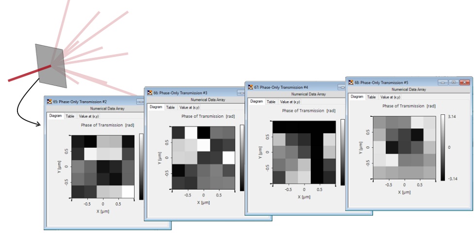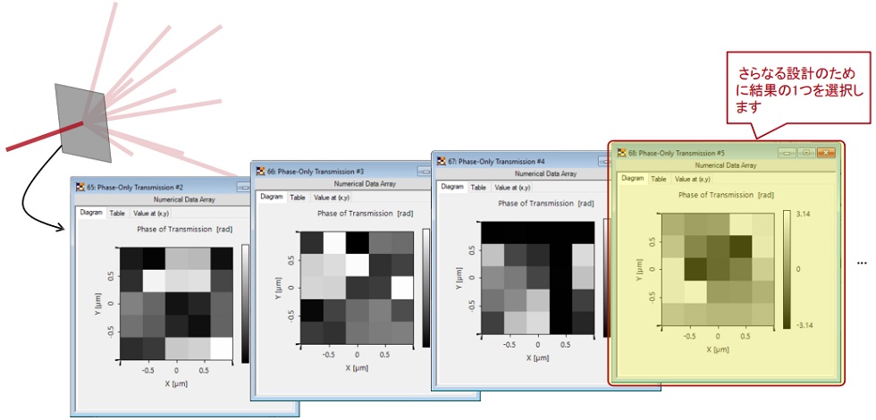 ランダムに異なる位相分布を出発点として、IFTA(反復フーリエ変換アルゴリズム)でいくつかの有望な設計結果を計算します。
