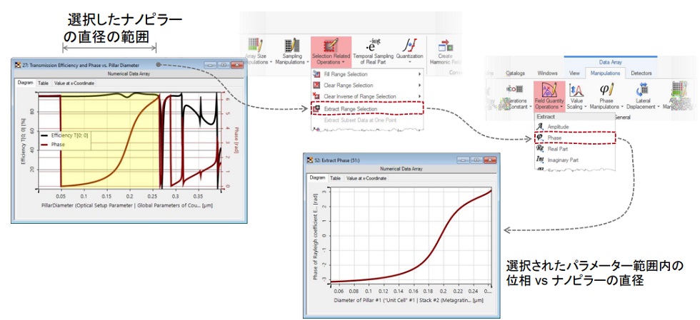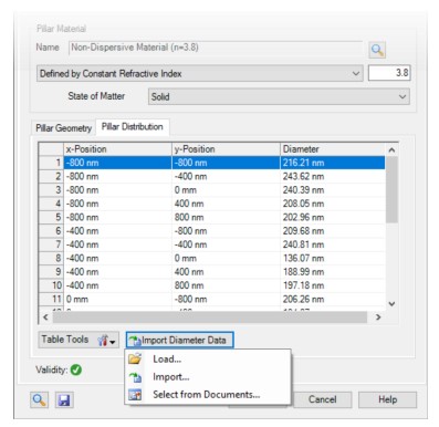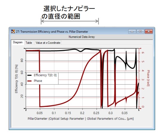この例では、ナノピラーの配置はVirtualLabのC#モジュールのサンプルファイル ”Appx_02_Calculate Pillar Diameters from Phase Profile.cs"で実行できます。