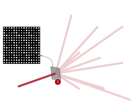 メタグレーティングは、旧来のグレーティングと比較すると、特に非近軸の場合で優れて いることがわかっています。この例では、入射波を3 x 3のビームに分岐する2次元(2D)のメタグレーティングを設計します。これは円柱形のナノピラーで構築されており、VirtualLab Fusionでは、FMM/RCWAを用いてメタグレーティングの回折効率を評価します。また、回折効率の均一性を改善するために使用するパラメトリック最適化ツールの使い方も、ここで示します。