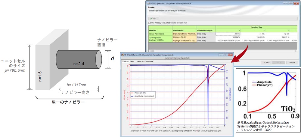 この事例におけるメタレンズの構成ブロックは、円柱状誘電体ナノピラーです。ユニットセルのサイズおよびピラーの高さは、参考文献で選択されているため、ピラーによって与えられる位相は、パラメーターランを使用して、その直径の関数として計算することができます。右図はピラー径と位相値の関係を示しています。