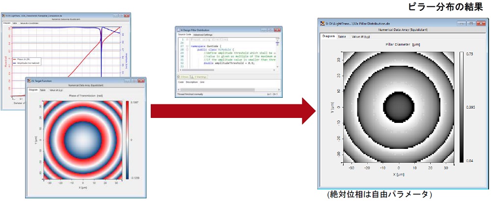 所望の光学関数と、選択されたタイプのメタアトムによって提供される位相値とによって、横方向の分布を設計することができます。このステップでは、所望の位相の横方向分布を生成するために適切なピラーの直径を選択するモジュールが使用されます。