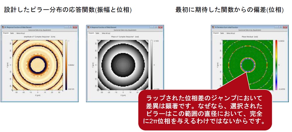 ピラー分布の設計時に、メタレンズの期待される応答と、最初に期待した関数からの偏差も出力として提供されます: