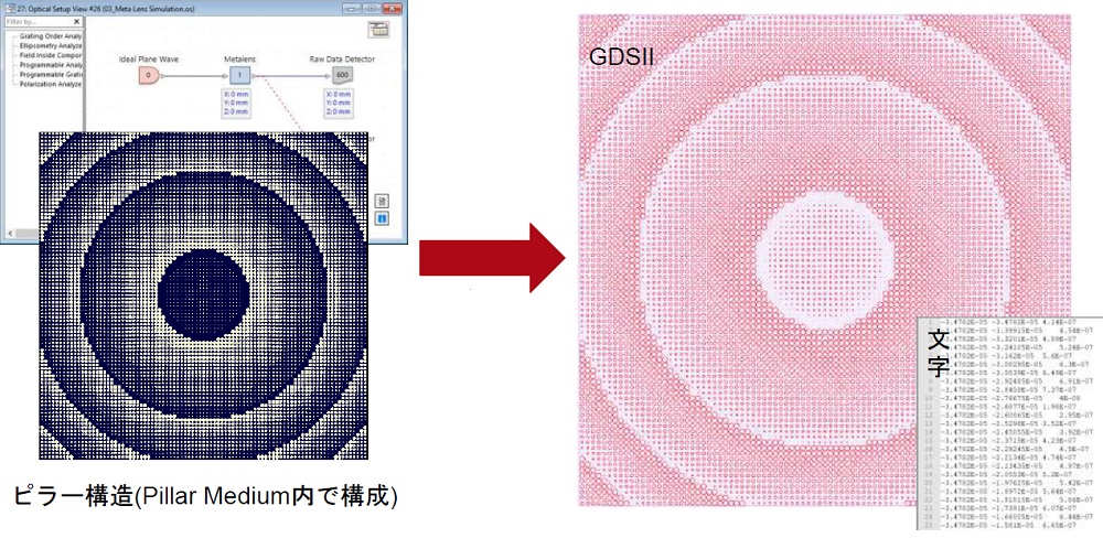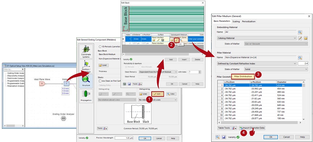 メタレンズをセットアップするために、General Grating Component(Grating Specific Optical Setup)でピラー直径の分布をPillar Mediumにインポートします。