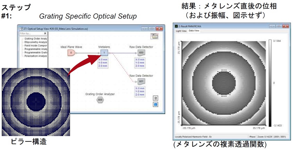ピラー構造の機能をモデル化するために、Fourier Modal 法(FMM、RCWAとしても知られる)を適用しました。この目的のために、General Optical Componentを有するGrating Specific Optical Setupが使用されます。設計段階で使用される方法とは対照的に、今度は、結果として生じる位相は、近接する異なるピラーの相互作用を含みます。