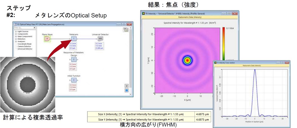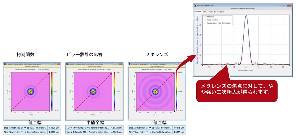 初期関数の焦点スポットおよび設計されたピラー構造の応答は、同一のスポットを提供しますが、ピラー構造を通る伝搬は、いくつかの収差を引き起こします。しかしながら、設計されたメタレンズは、依然として、元の位相関数と同様のサイズおよび構造の焦点を提供します。この結果は、その後の最適化の出発点となります。